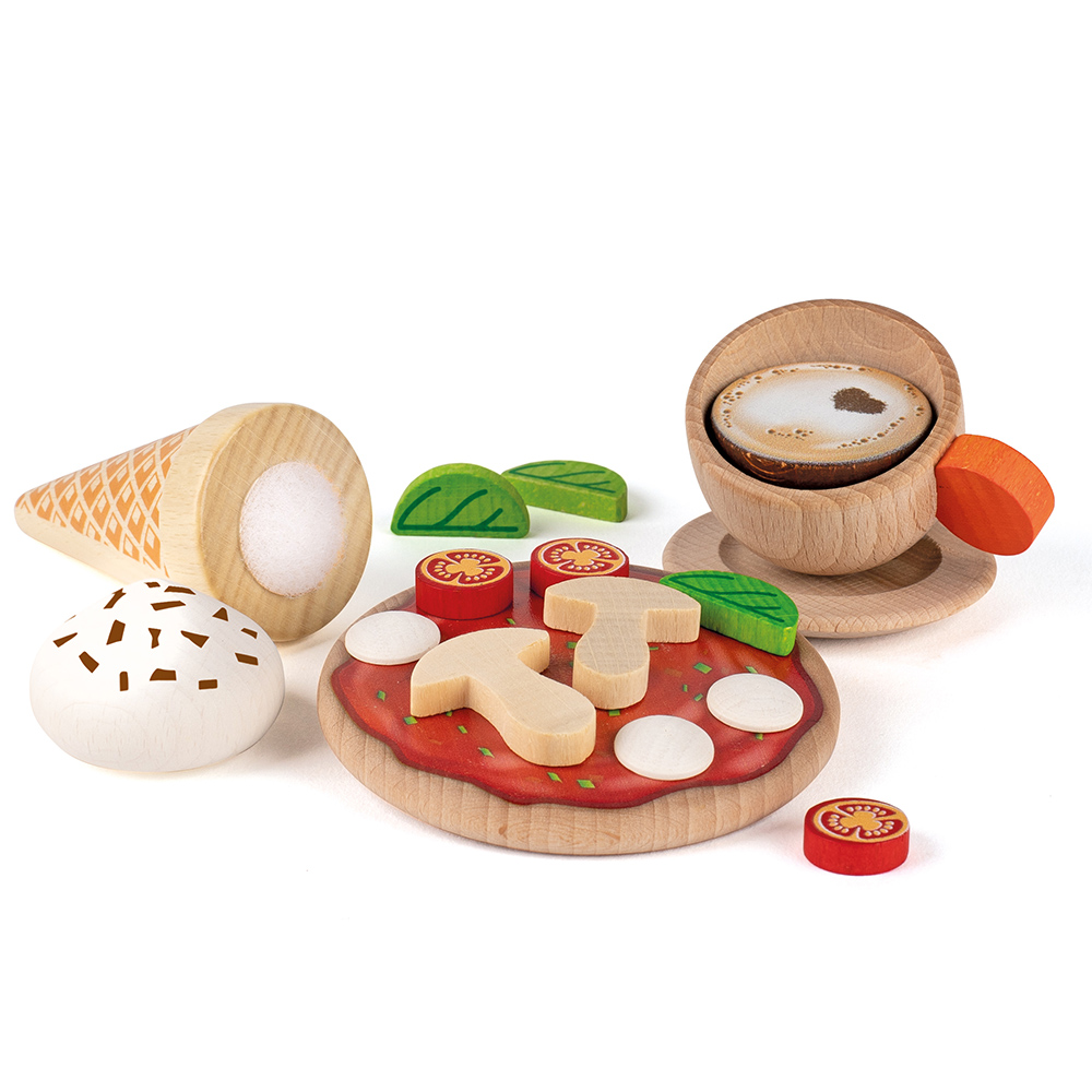 Un kit complet pour constituer un vrai repas italien contenant 17 pièces en bois : 1 base de pizza, 2 tranches de champignons, 3 tranches de tomates cerises, 3 morceaux de mozzarella, 3 feuilles de basilic, 1 tasse avec cappuccino, 1 soucoupe, 1 cornet de glace avec velcro.