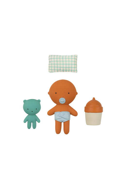 Dimensions : bébé 10 cm, ours 6 cm, biberon 5 cm